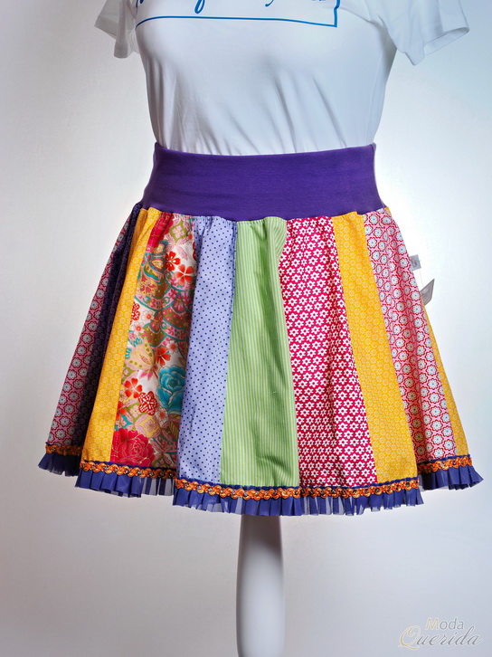 Dieser Tellerrock besteht aus 16 Bahnen aus verschiedenen Stoffen mit individuellem Muster.
